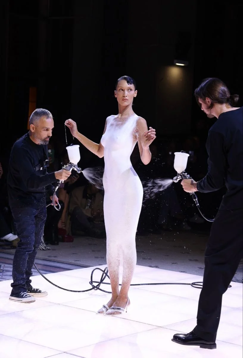 The Moment: When Bella Hadid stepped onto the runway at Paris Fashion Week and had a white spray-on dress created on her body in real time, the world stopped watching fashion and started watching art in motion. That moment wasn’t just about design — it was about confidence, vulnerability, and transformation on display.